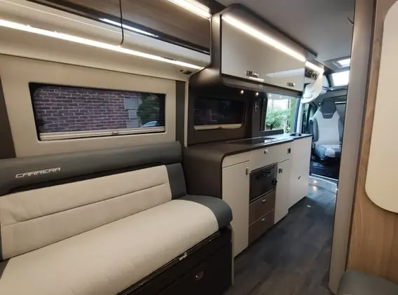 The beauty continues on the inside with stunning choice of materials in both cabinetry and upholstery Swift have really hit the sweet spot with the Carrera. Enter the sliding side door in to the large well equipped kitchen with hob, oven/grill, stainless steel sink and on trend skinny fridge freezer with duel access. Adjacent is the bathroom with toilet, sink and wet room shower. The front captain seats swivel there are two further forward facing seats in the front dinette/ lounge fitted with those all important three point seat belts. They even have the added benefit of isofix should you require.